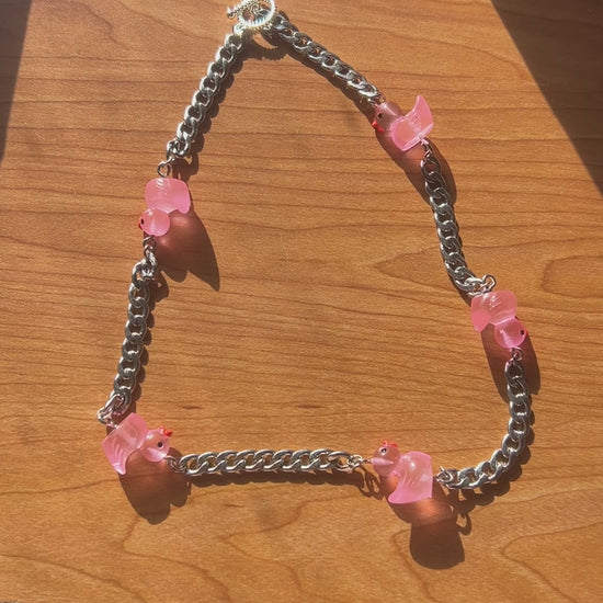 Pink Translucent Premium Duck Necklace with stainless steel Cuban links evenly between each charm